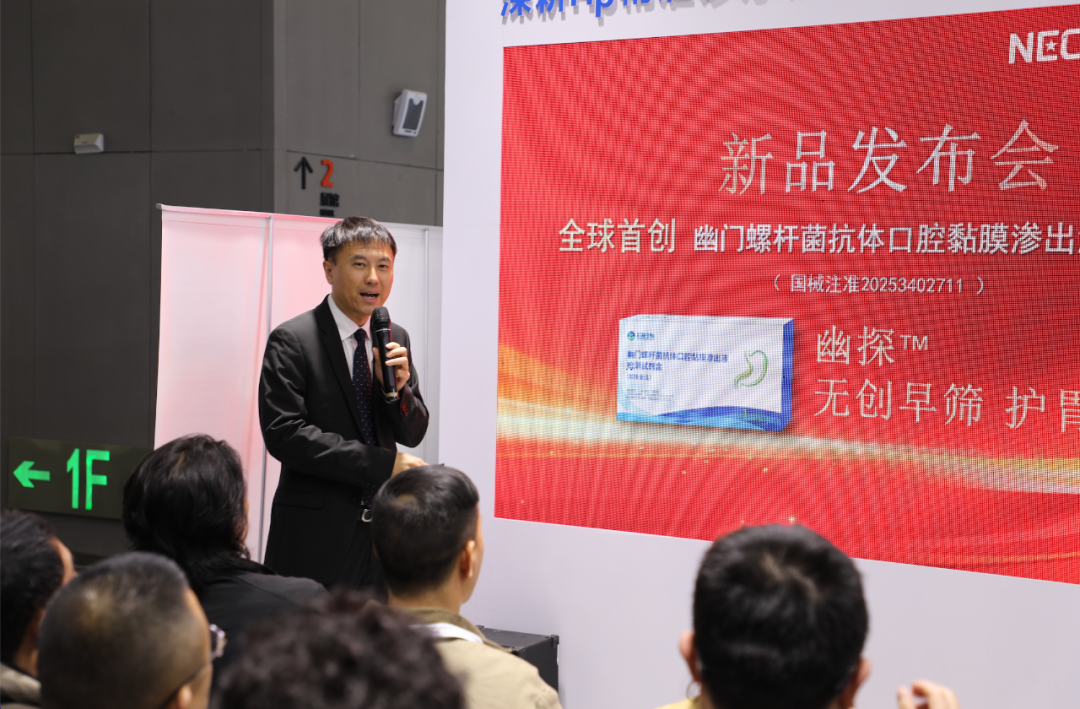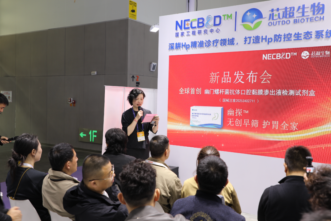 芯超生物副总裁叶扬登台发布重磅新品——幽门螺杆菌抗体口腔黏膜渗出液检测试剂盒(幽探™),这款拥有三类医疗器械注册证(国械注准20253402711)的产品,通过人口腔黏膜渗出液无创便捷地检测Hp抗体,属全球首创,标志着 Hp 无创早筛领域迎来全新突破。